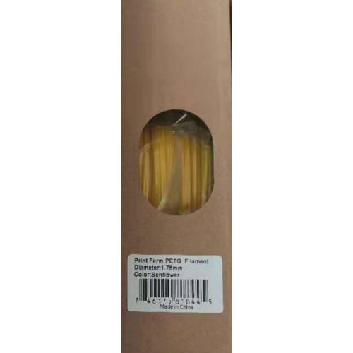 Each Print Farm PETG Sunflower 1 kg package contains a 1 kg (~2.20 lbs) spool of 1.75mm diameter PETG filament for FDM printers with a dimensional accuracy of +/- 0.03 mm). We recommend printing at a nozzle temperature of 220°C - 260°C (446°F - 500°F) and a bed temperature of 70°C.